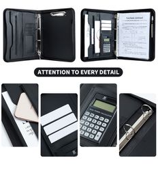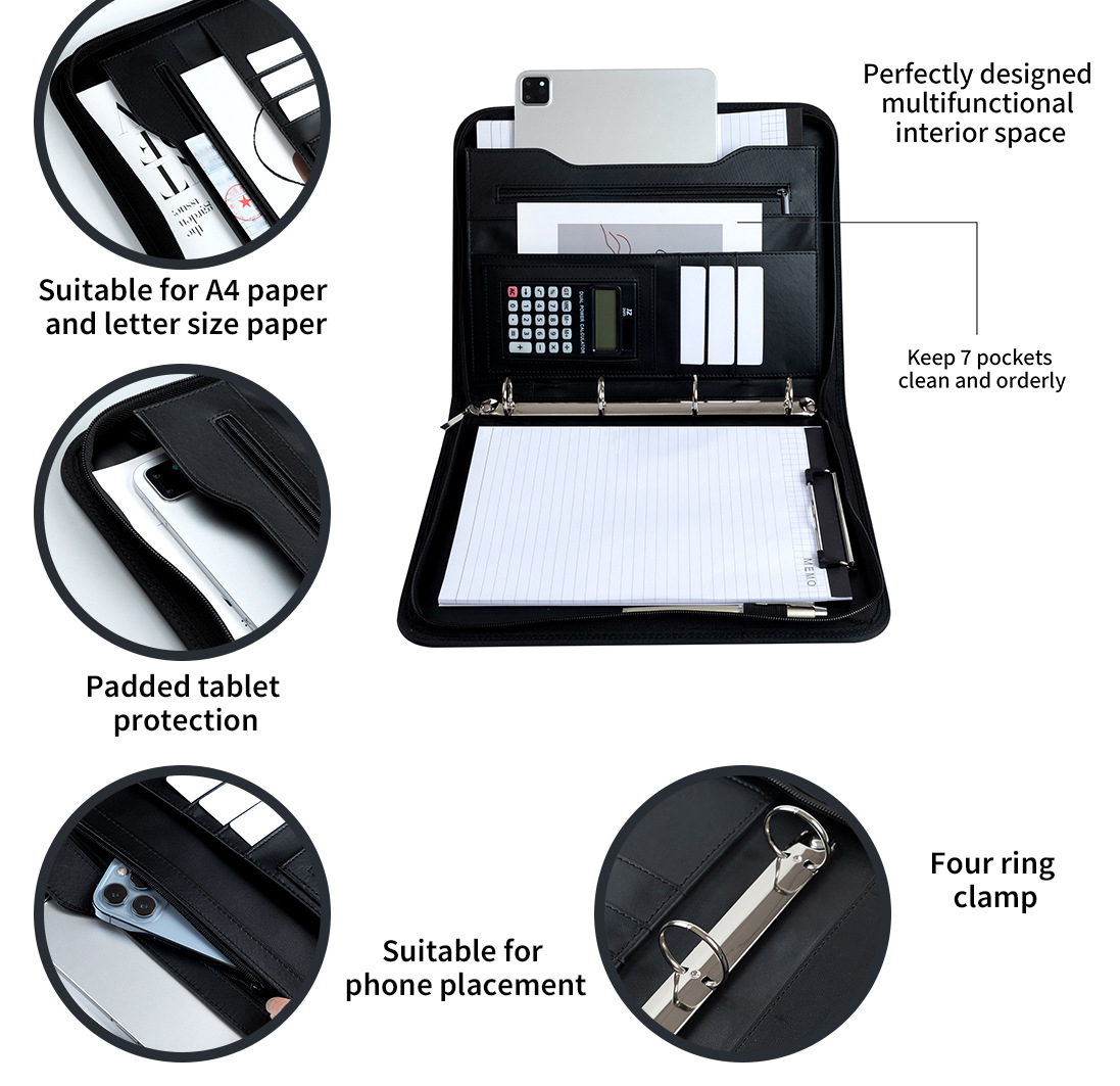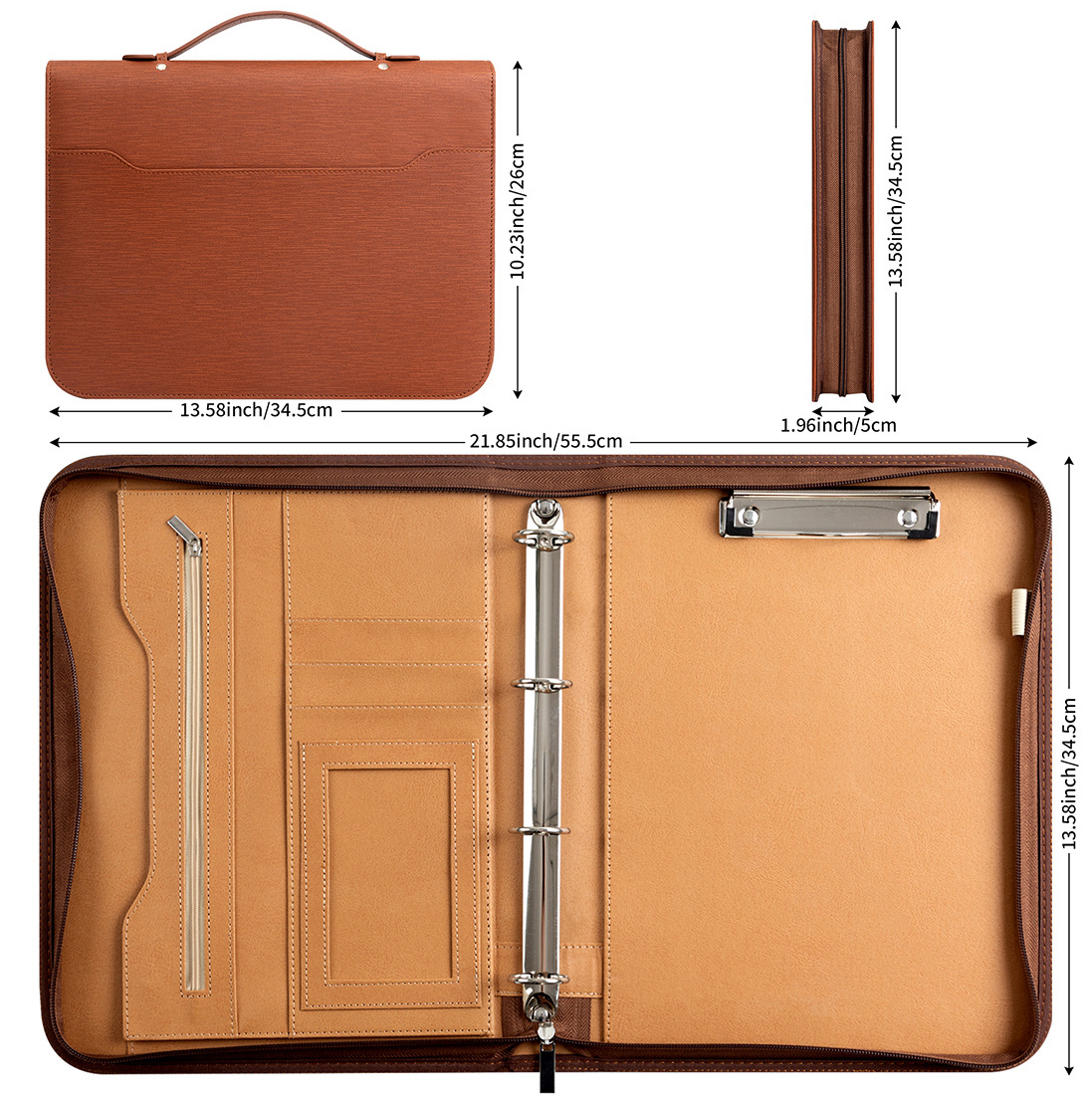 Made from eco-friendly PU leather, this folder is crafted with high standard quality, ensuring durability and longevity.Whether you're a student, teacher, lawyer, or business professional, this leather portfolio organizer for men women elevates your presentation, making it a stylish and practical portfolio folder companion for work or travel. Features include solar calculator, full PU leather interior, dual start zipper, and abundant storage so paper never crunches or falls out.Compact for travel: Leather folder looks gorgeous held in hand walking into the board meeting, law school, or interview while sliding neatly into handbags, backpacks while maintaining far greater storage than traditional leather planners.